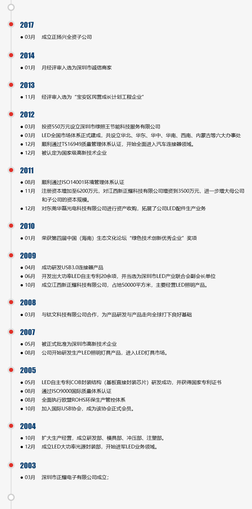 正耀科技成立于2003年,初期主要從事3C電子連接器之設(shè)計(jì)、制造與銷(xiāo)售,經(jīng)過(guò)近十多年的經(jīng)營(yíng)和擴(kuò)張,公司已經(jīng)初具規(guī)模,成為跨行業(yè)的集團(tuán)公司,在連接器和大功率LED燈行業(yè)已經(jīng)建立了相當(dāng)?shù)闹取?br />